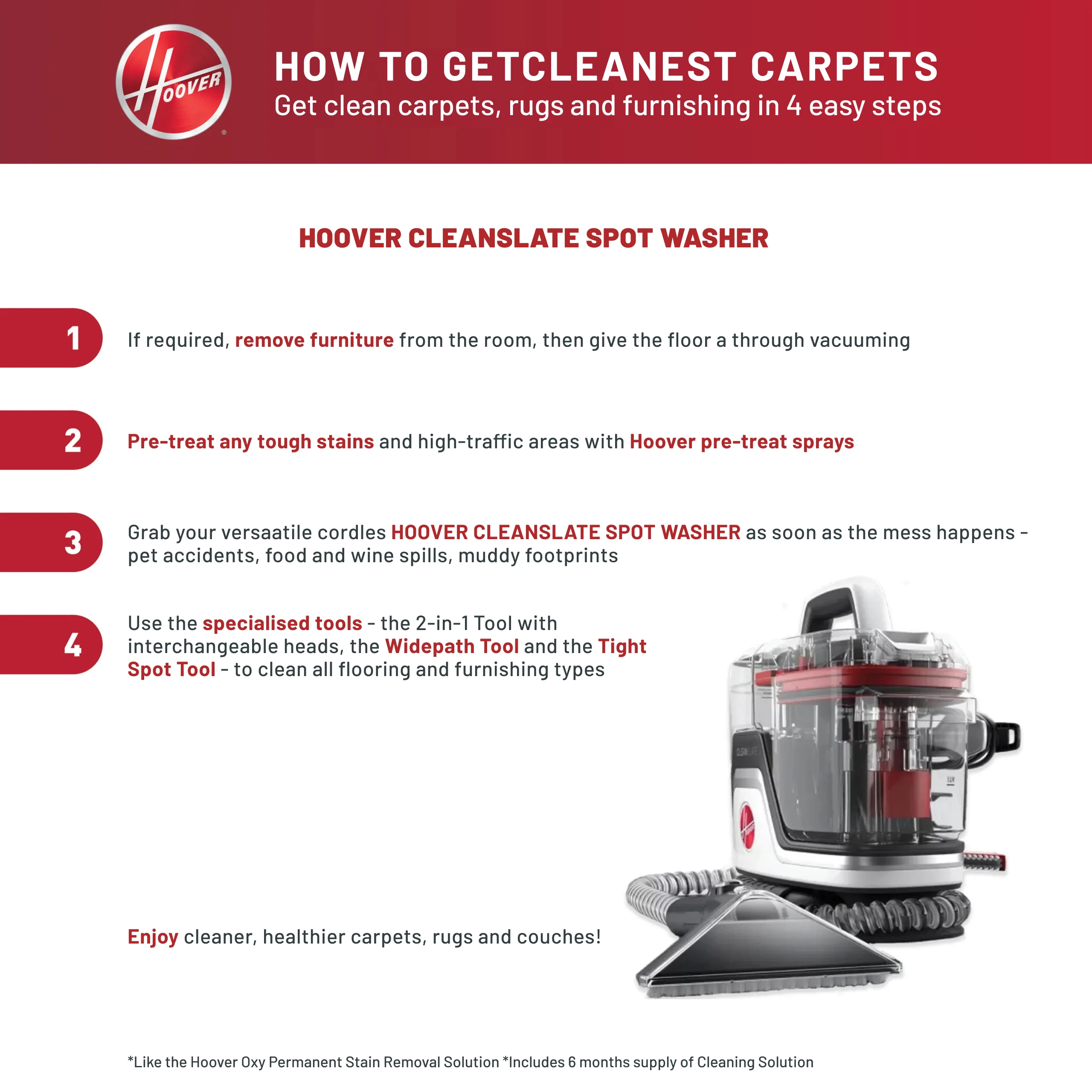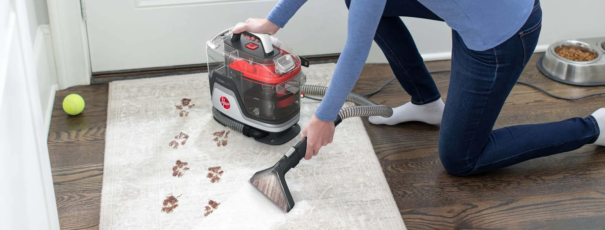 The Hoover CleanSlate Spot Cleaner combines powerful suction, versatile tools, and the performance of the Oxy formula to permanently remove stains and messes. With our WidePath Tool for large areas like stairs and the Tight Spot Tool for crevices and tough to reach areas, you’ll have the flexibility you need to clean messes of any size. Quickly remove spills and stains on the go thanks to a light, portable design and a long cord so you can easily move between areas.