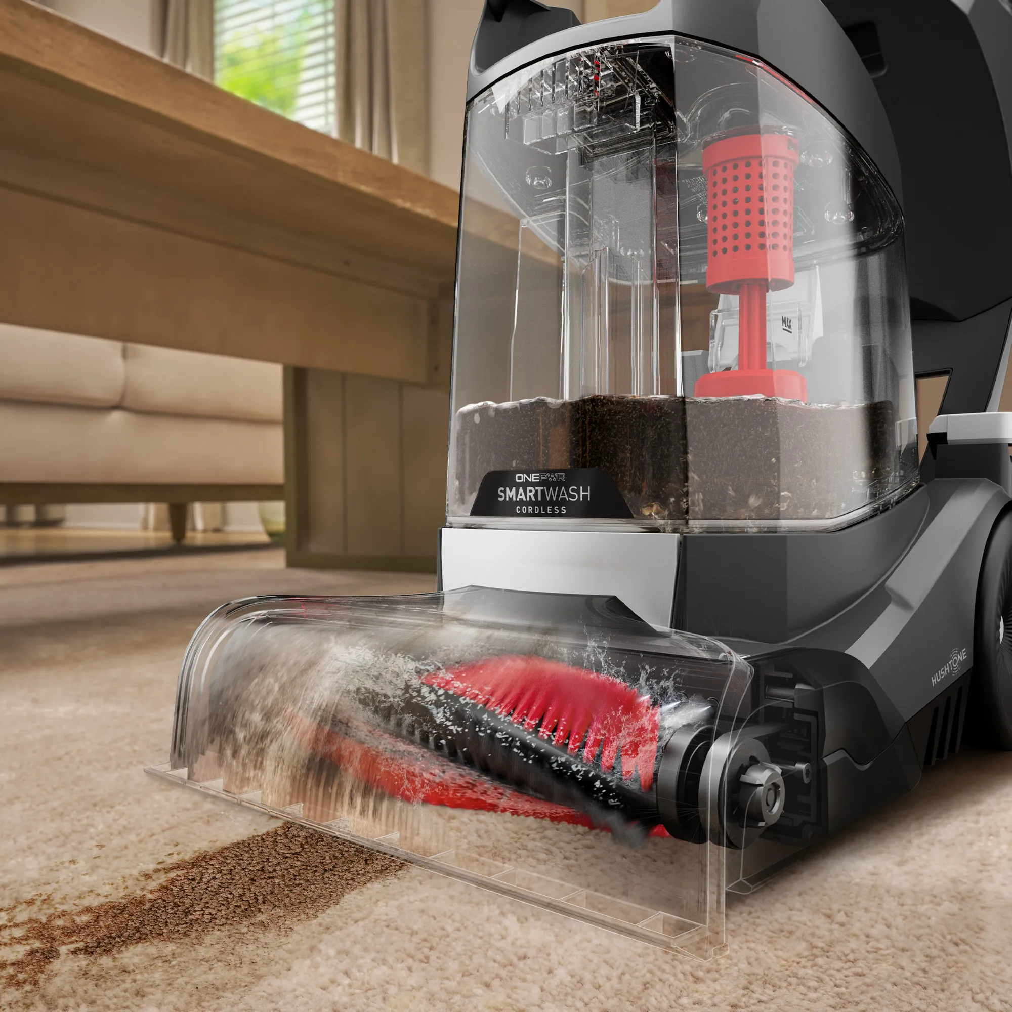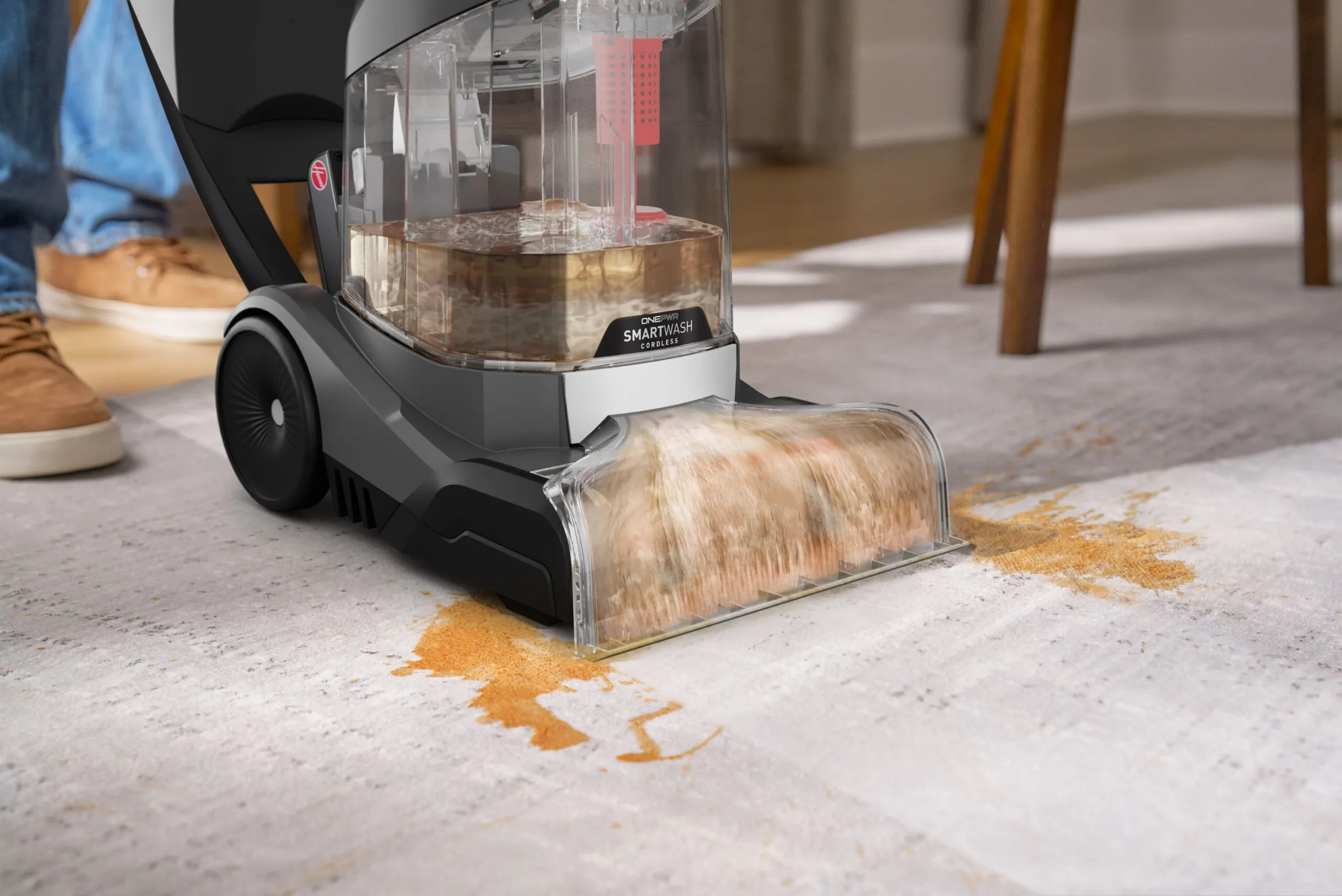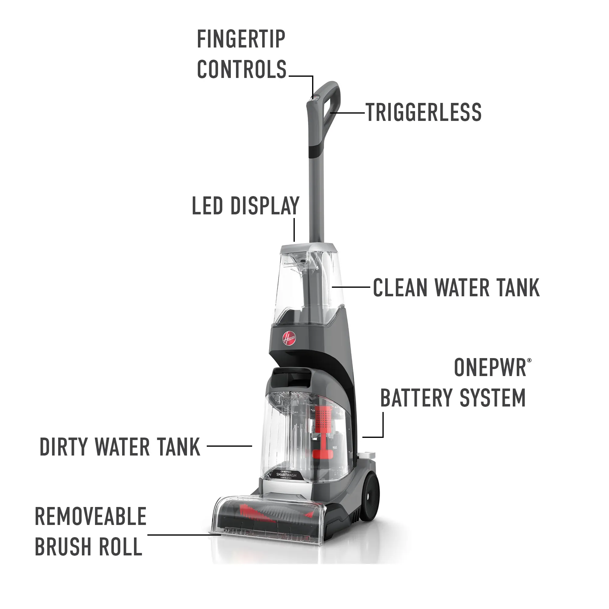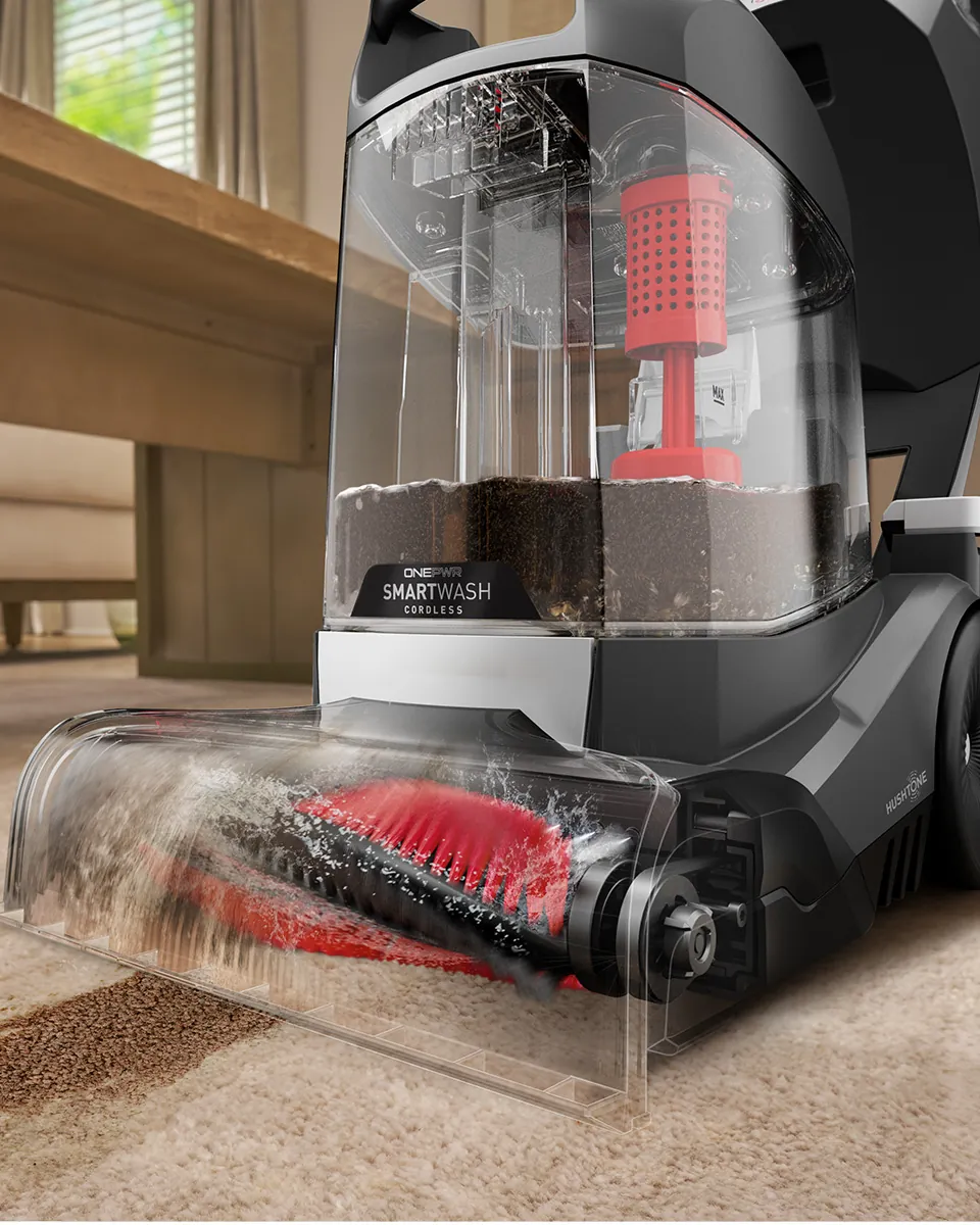 Hoover ONEPWR SmartWash is the world’s first Hoover cordless carpet cleaner, packed with advanced and intuitive tech. This powerful carpet cleaner combines triggerless, automatic cleaning technology – automatically sensing when to wash and dry —with TruMAX Technology for extended cleaning sessions. Tackle deep, set-in stains effortlessly with the Spot Mode, while tool-free and hassle-free cleanup is ensured with the removable dirty water tank lid, nozzle, and brush roll