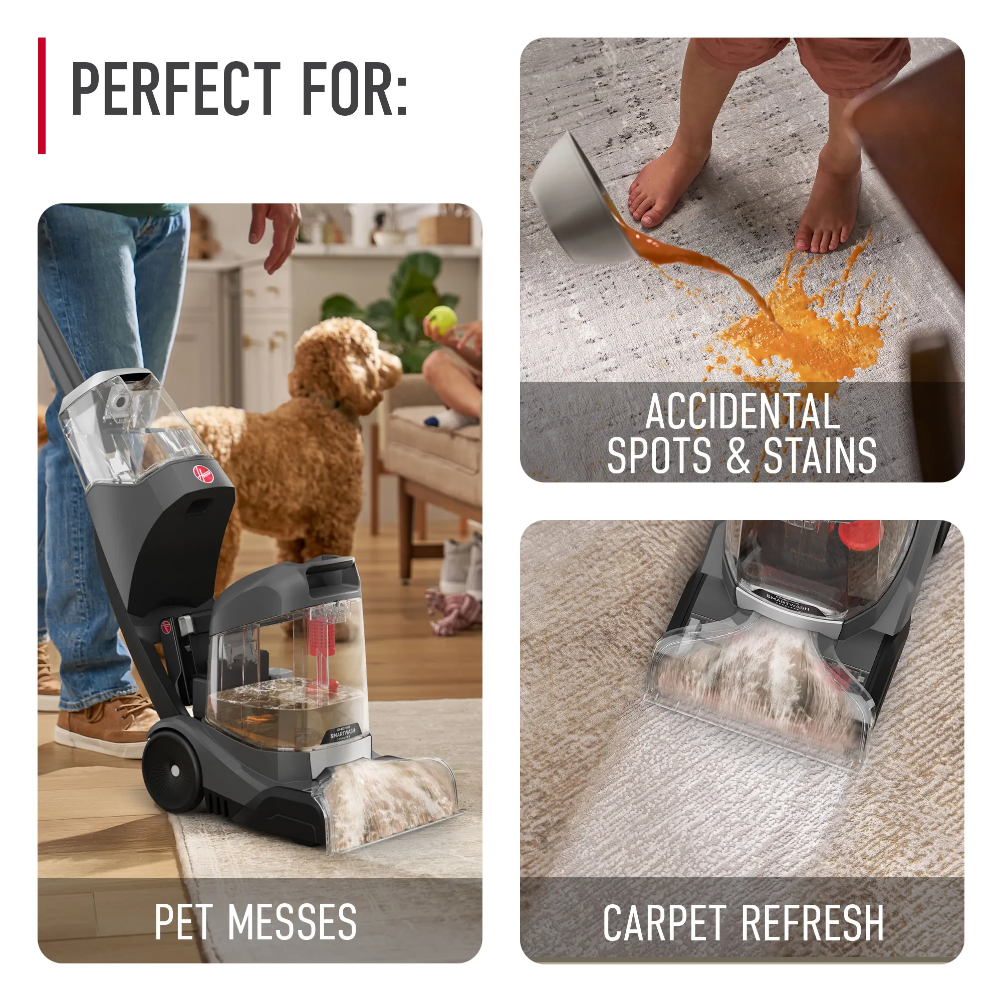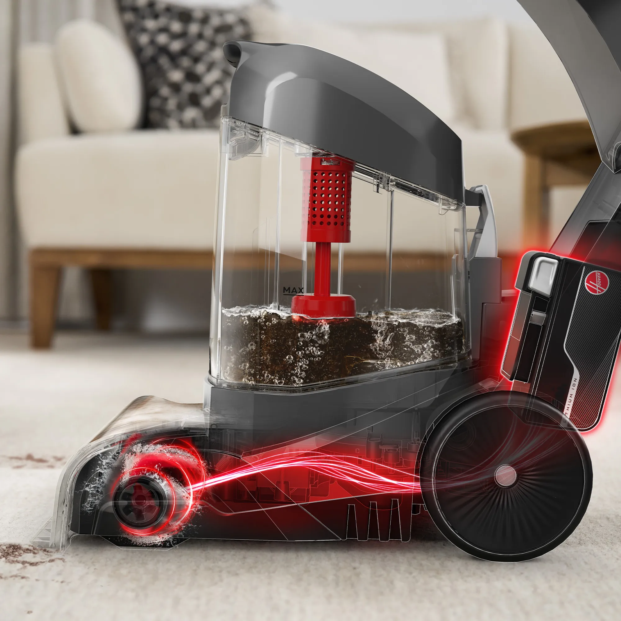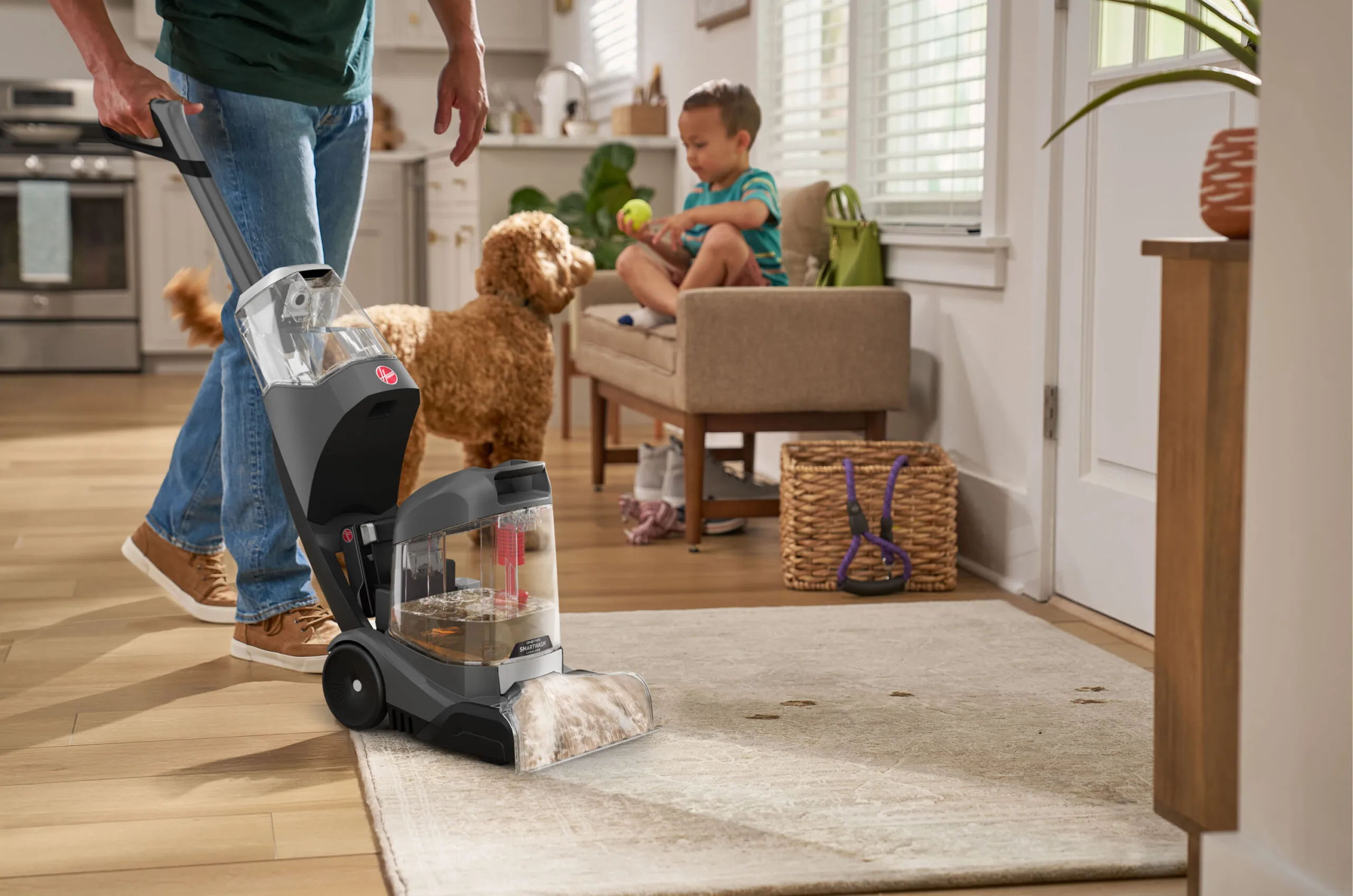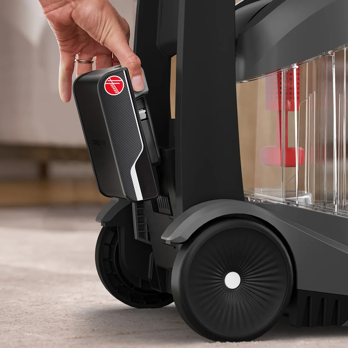Hoover ONEPWR SmartWash is the world’s first Hoover cordless carpet cleaner, packed with advanced and intuitive tech. This powerful carpet cleaner combines triggerless, automatic cleaning technology – automatically sensing when to wash and dry —with TruMAX Technology for extended cleaning sessions. Tackle deep, set-in stains effortlessly with the Spot Mode, while tool-free and hassle-free cleanup is ensured with the removable dirty water tank lid, nozzle, and brush roll
